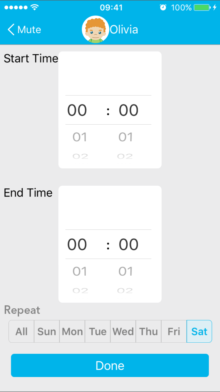 4. To add new muting times, press on the icon on the top right corner of the screen. You can set the start/end muting time by sliding your finger up/down to select the time. Select the date to repeat the mute. Press "Done" when you finished setting the mute.
